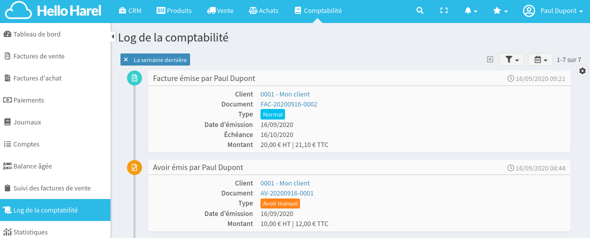 Tous les événements de votre comptabilité sont affichés dans cet écran : validation ou annulation d'un document comptable (facture, avoir), d'un paiement, d'une remise de chèques, suivi de facturation (relevés de factures, relances de paiement...), etc.