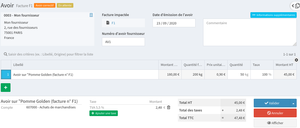 L'écran d'affichage et d'édition d'un avoir d'achat sont généralement le même, sauf qu'un avoir en édition (statut En attente ou En édition) peut être édité, alors qu'un avoir validé est affiché en lecture seule.