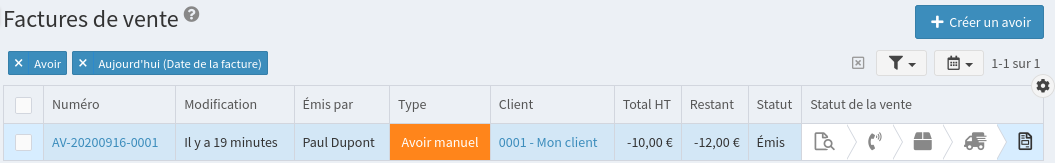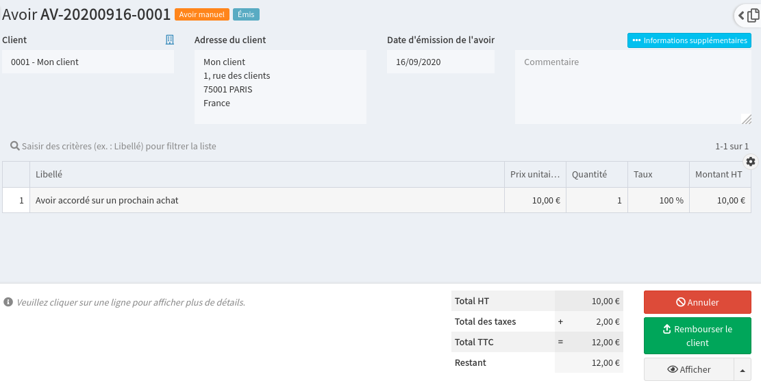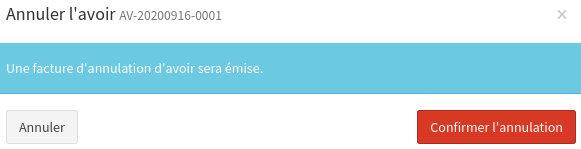 L'annulation d'un avoir émis se passe exactement comme celle d'une facture. Une facture d'annulation d'avoir est émise, de montant égal, qui annule l'avoir.
