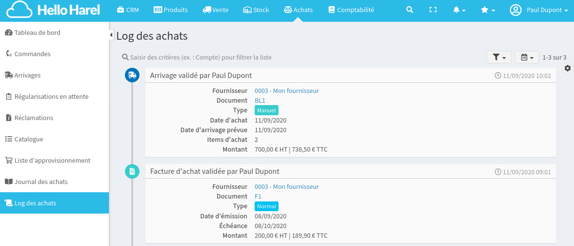 Tous les événements liés à un achat (validation ou annulation d'un document d'achat : commande, arrivage et même facture) sont affichés dans cet écran.