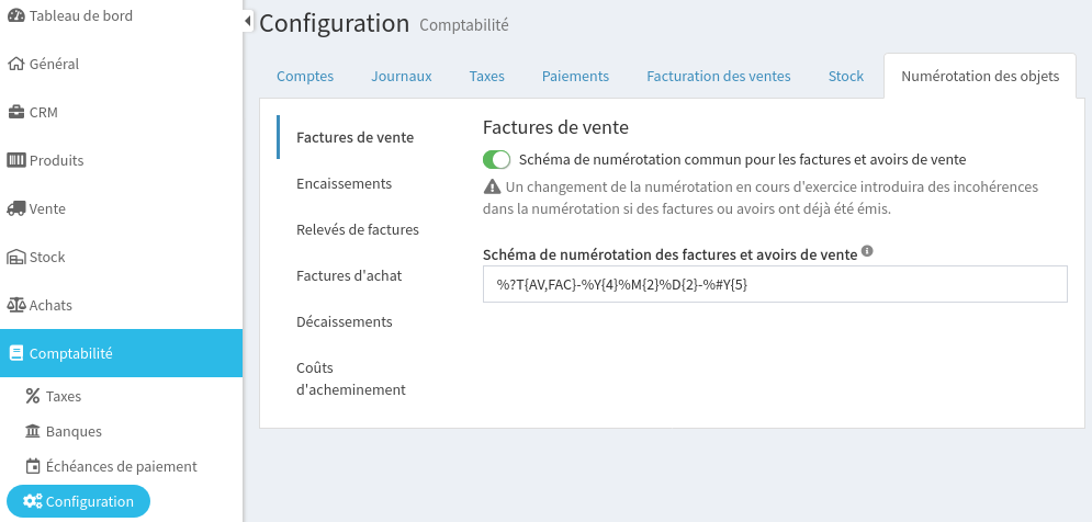 Exemple : %?T{AV,FAC}-%Y%M%D-%#D{4} renverra par exemple FAC-20250901-0001 pour la première facture émise le 1er septembre 2025.